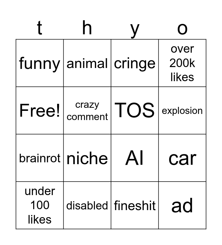 This bingo card has 16 words: disabled, car, cringe, funny, brainrot, animal, AI, fineshit, Free!, crazy comment, under 100 likes, over 200k likes, niche, explosion, TOS and ad.