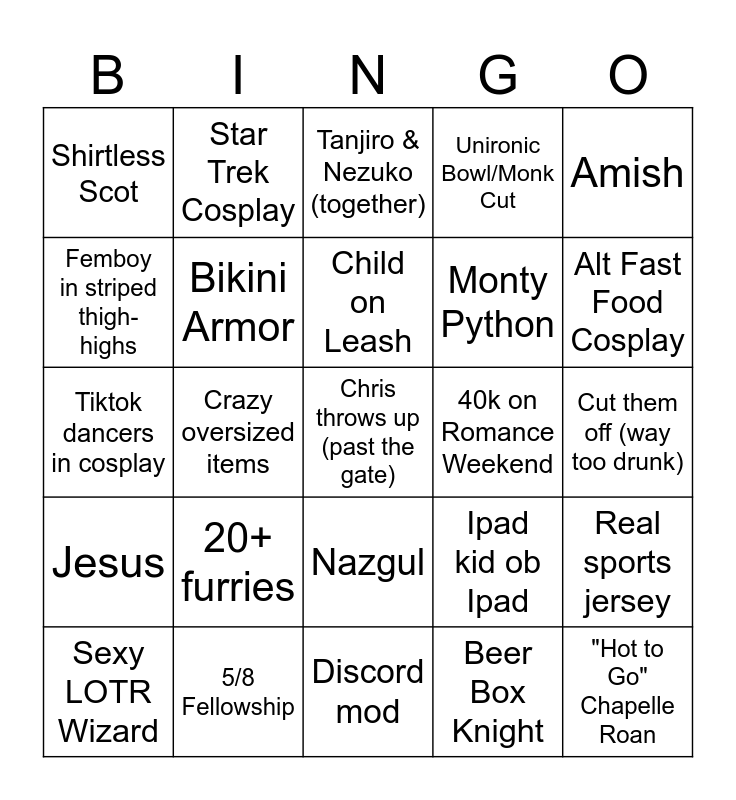 This bingo card has a free space and 24 words: 20+ furries, 5/8 Fellowship, Child on Leash, Sexy LOTR Wizard, Amish, Shirtless Scot, Femboy in striped thigh-highs, Star Trek Cosplay, 40k on Romance Weekend, Nazgul, Monty Python, Tiktok dancers in cosplay, Ipad kid ob Ipad, Real sports jersey, Bikini Armor, Beer Box Knight, Cut them off (way too drunk), Tanjiro & Nezuko (together), Alt Fast Food Cosplay, Crazy oversized items, "Hot to Go" Chapelle Roan, Jesus, Unironic Bowl/Monk Cut and Discord mod.