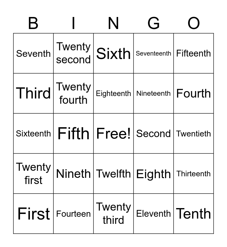 This bingo card has a free space and 24 words: First, Nineth, Eighteenth, Eleventh, Fifteenth, Seventh, Twenty second, Sixth, Second, Twentieth, Sixteenth, Twenty fourth, Eighth, Thirteenth, Third, Fourteen, Twenty third, Seventeenth, Fourth, Twenty first, Fifth, Twelfth, Nineteenth and Tenth.