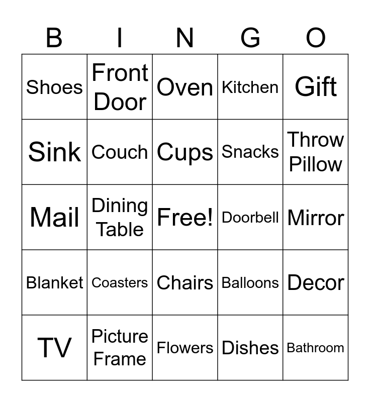 This bingo card has a free space and 36 words: Welcome Mat, Candles, Plants, Snacks, Decor, TV, Couch, Drinks, Kitchen, Keys, Mail, Front Door, Chairs, Dishes, Mirror, Shoes, Picture Frame, Oven, Balloons, Gift, Blanket, Coasters, Cups, Napkins, Bathroom, Sink, Dining Table, Moving Boxes, Doorbell, Throw Pillow, Welcome Sign, Candlelight, Flowers, Toaster, Framed Photo and Remote Control.