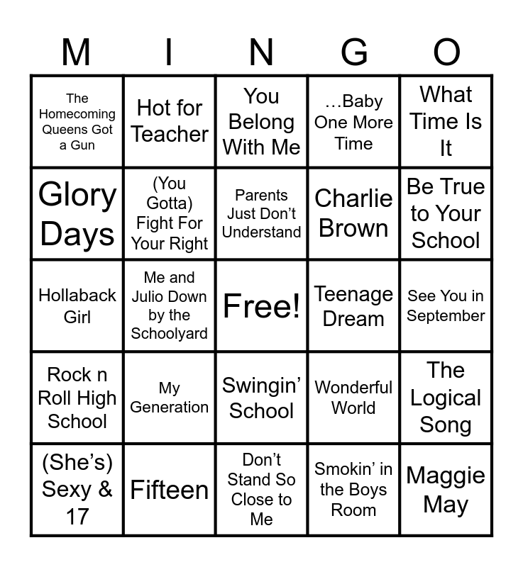 This bingo card has a free space and 35 words: Teacher, Teacher, Walk This Way, Schools Out, (You Gotta) Fight For Your Right, Swingin’ School, …Baby One More Time, Glory Days, School Days, Parents Just Don’t Understand, Pumped Up Kicks, Hollaback Girl, What Time Is It, Harper Valley PTA, No Such Thing, The Homecoming Queens Got a Gun, Teenage Dream, Smokin’ in the Boys Room, Me and Julio Down by the Schoolyard, Rock n Roll High School, Maggie May, Wonderful World, (She’s) Sexy & 17, The Logical Song, Fifteen, You Belong With Me, Be True to Your School, Getting Better, I Don’t Like Mondays, Charlie Brown, See You in September, ABC, Don’t Stand So Close to Me, My Generation, Hot for Teacher and Graduation (Friends Forever).