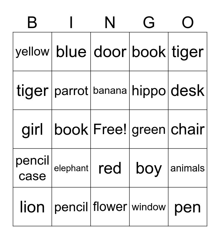 This bingo card has a free space and 25 words: elephant, flower, banana, lion, tiger, yellow, tiger, blue, green, red, hippo, girl, boy, animals, parrot, teacher, chair, door, desk, book, pen, pencil, pencil case, book and window.