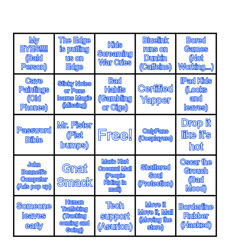 This bingo card has a free space and 24 words: Gnat Smack, Human Trafficking (Tracking coming and Going), Bad Habits (Gambling or Cigs), Someone leaves early, Bored Games (Not Working...), My EYES!!!! (Bald Person), Cave Paintings (Old Phones), The Edge is putting us on Edge, OnlyFans (Cosplayers), Mario Kart Coconut Mall (People Riding in mall), Certified Yapper, Password Bible, Shattered Soul (Protection), Oscar the Grouch (Bad Mood), Sticky Notes or Pens learns Magic (Missing), Move it Move it, Mall (Moving the store), Drop it like it's hot, Kids Screaming War Cries, IPad Kids (Looks and leaves), Mr. Fister (Fist bumps), Borderline Rubber (Hacked), John Bennett's Computer (Ads pop up), Bluelink runs on Dunkin (Caffeine) and Tech support (Asurion).