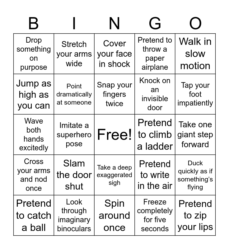 This bingo card has a free space and 25 words: Slam the door shut, Spin around once, Snap your fingers twice, Pretend to catch a ball, Walk in slow motion, Drop something on purpose, Jump as high as you can, Stretch your arms wide, Pretend to climb a ladder, Take a deep exaggerated sigh, Knock on an invisible door, Wave both hands excitedly, Pretend to write in the air, Duck quickly as if something’s flying, Point dramatically at someone, Pretend to lift something heavy, Take one giant step forward, Cover your face in shock, Tap your foot impatiently, Imitate a superhero pose, Pretend to zip your lips, Look through imaginary binoculars, Cross your arms and nod once, Pretend to throw a paper airplane and Freeze completely for five seconds.
