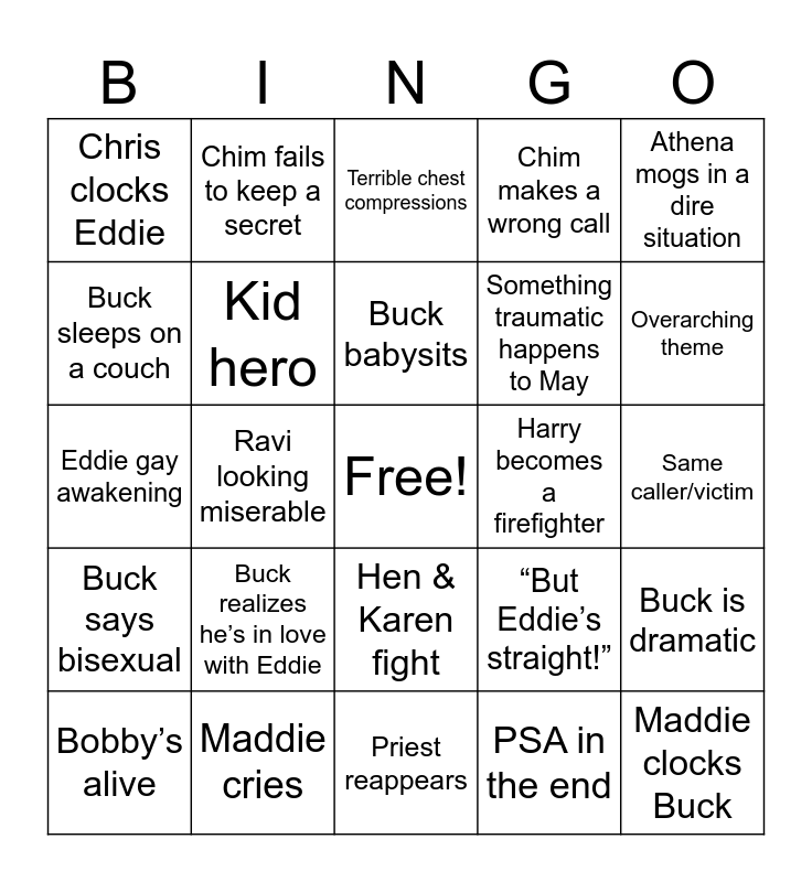 This bingo card has a free space and 24 words: Buck realizes he’s in love with Eddie, Maddie cries, Buck babysits, Bobby’s alive, Athena mogs in a dire situation, Chris clocks Eddie, Buck sleeps on a couch, Chim fails to keep a secret, Harry becomes a firefighter, Hen & Karen fight, Something traumatic happens to May, Eddie gay awakening, “But Eddie’s straight!”, Buck is dramatic, Kid hero, PSA in the end, Same caller/victim, Terrible chest compressions, Overarching theme, Ravi looking miserable, Maddie clocks Buck, Buck says bisexual, Chim makes a wrong call and Priest reappears.