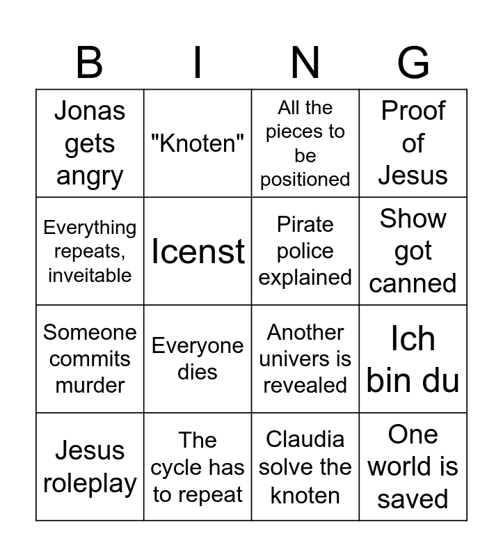 This bingo card has 16 words: The cycle has to repeat, Ich bin du, All the pieces to be positioned, Jonas gets angry, Someone commits murder, "Knoten", Another univers is revealed, Claudia solve the knoten, Everything repeats, inveitable, Icenst, Jesus roleplay, Proof of Jesus, Everyone dies, Show got canned, Pirate police explained and One world is saved.