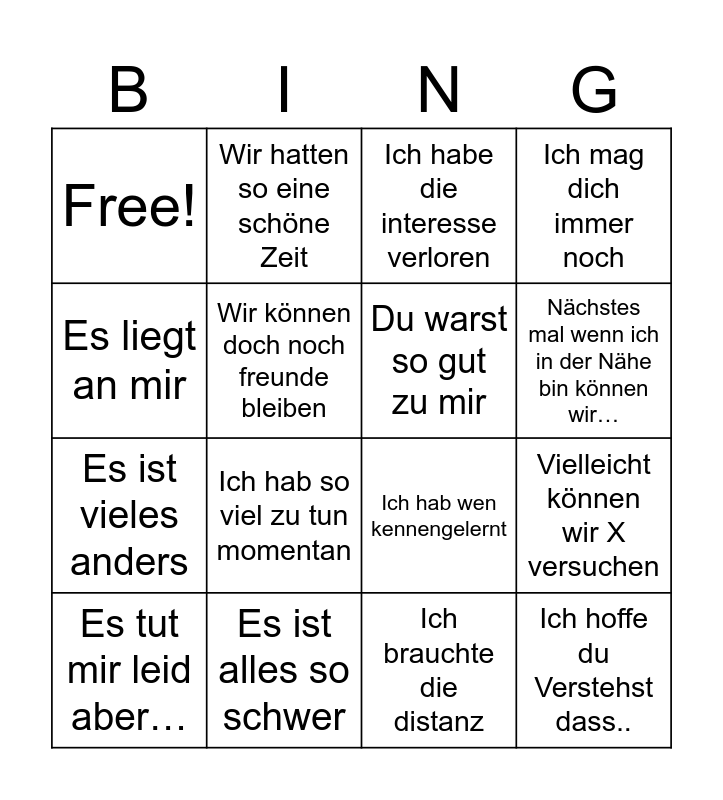 This bingo card has 16 words: Es tut mir leid aber…, Es ist alles so schwer, Ich habe die interesse verloren, Ich mag dich immer noch, Es liegt an mir, Wir hatten so eine schöne Zeit, Ich hab wen kennengelernt, Vielleicht können wir X versuchen, Free!, Wir können doch noch freunde bleiben, Ich brauchte die distanz, Nächstes mal wenn ich in der Nähe bin können wir…, Es ist vieles anders, Ich hab so viel zu tun momentan, Du warst so gut zu mir and Ich hoffe du Verstehst dass...