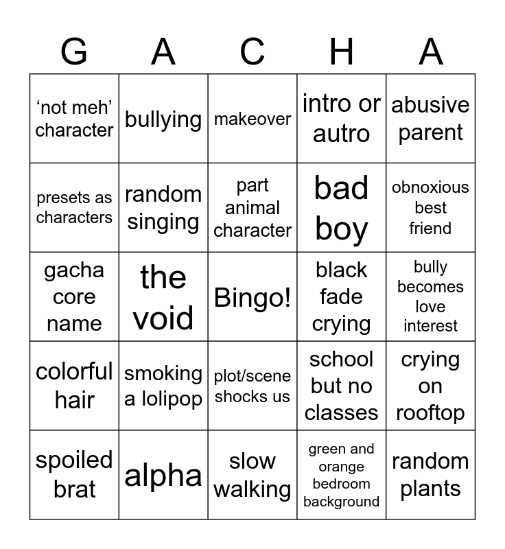 This bingo card has a free space and 24 words: smoking a lolipop, alpha, part animal character, spoiled brat, abusive parent, ‘not meh’ character, presets as characters, bullying, black fade crying, plot/scene shocks us, bad boy, gacha core name, school but no classes, crying on rooftop, random singing, green and orange bedroom background, bully becomes love interest, makeover, obnoxious best friend, the void, random plants, colorful hair, intro or autro and slow walking.