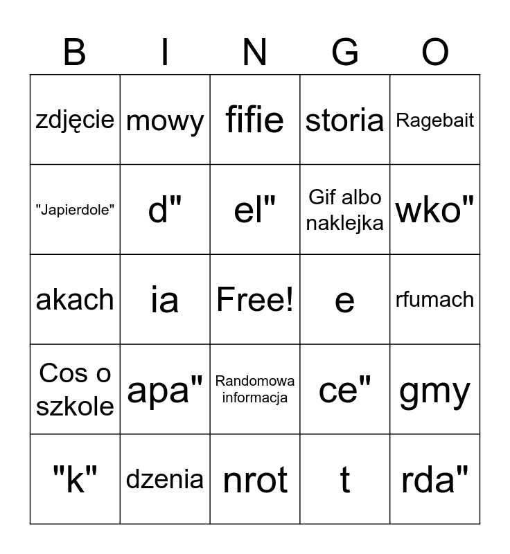 This bingo card has a free space and 24 words: "k", apa", el", t, Ragebait, zdjęcie, mowy, fifie, e, rfumach, akach, d", ce", gmy, "Japierdole", dzenia, nrot, storia, wko", Cos o szkole, ia, Randomowa informacja, Gif albo naklejka and rda".