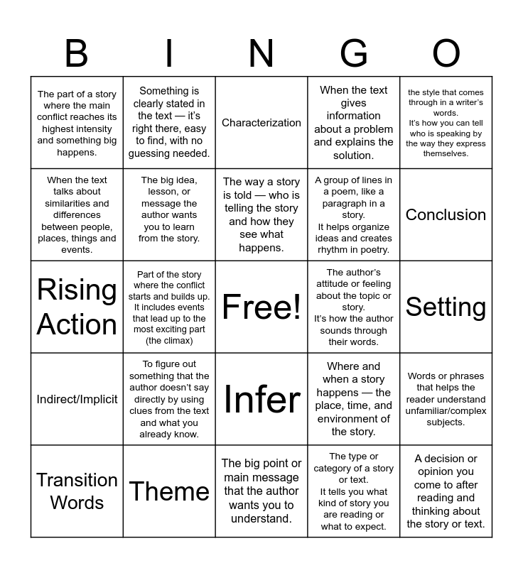 This bingo card has a free space and 48 words: Main idea or point of an essay or story., A decision or opinion you come to after reading and thinking about the story or text., Words or phrases that connect ideas and help your writing flow smoothly., The big point or main message that the author wants you to understand., To figure out something that the author doesn’t say directly by using clues from the text and what you already know., Something is not stated clearly or directly — you have to figure it out using clues., Something is clearly stated in the text — it’s right there, easy to find, with no guessing needed., The feeling or atmosphere that a reader gets from a story or text. (How the author wants you to feel while you read.), When the text talks about similarities and differences between people, places, things and events., When the text describes an effect (Cause) and the effects that follow., The big idea, lesson, or message the author wants you to learn from the story., When the text gives information about a problem and explains the solution., Words or phrases that helps the reader understand unfamiliar/complex subjects., Where and when a story happens — the place, time, and environment of the story., The moment in a story when the main problem/conflict reaches its most intense point and the story starts to change direction., a short retelling of the most important parts of a story . (what happened but leaves out small details and opinions.), The way a story is told — who is telling the story and how they see what happens., The author’s attitude or feeling about the topic or story. It’s how the author sounds through their words., How the author shows what characters are like (direct or indirect), the style that comes through in a writer’s words. It’s how you can tell who is speaking by the way they express themselves., Part of the story where the conflict starts and builds up. It includes events that lead up to the most exciting part (the climax), The type or category of a story or text. It tells you what kind of story you are reading or what to expect., The part of a story where the main conflict reaches its highest intensity and something big happens., A group of lines in a poem, like a paragraph in a story. It helps organize ideas and creates rhythm in poetry., Thesis, Conclusion, Transition Words, Main Idea/ Central Idea, Infer, Indirect/Implicit, Direct/Explicit, Mood, Compare/Contrast, Cause/Effect, Theme, Problem and solution, Vocabulary Words, Setting, Turning point, Summary, Point of view, Tone (Sound), Characterization, Voice (Who), Rising Action, Genre, Climax and Stanza.