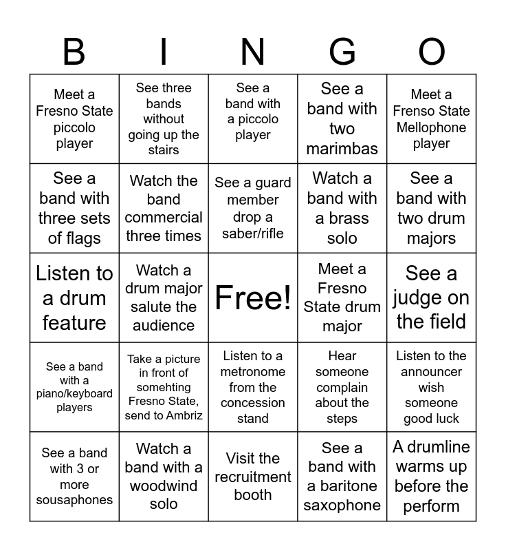 This bingo card has a free space and 24 words: Take a picture in front of somehting Fresno State, send to Ambriz, Watch a band with a woodwind solo, See a guard member drop a saber/rifle, See a band with 3 or more sousaphones, Meet a Frenso State Mellophone player, Meet a Fresno State piccolo player, See a band with three sets of flags, See three bands without going up the stairs, Meet a Fresno State drum major, Listen to a metronome from the concession stand, Watch a band with a brass solo, Listen to a drum feature, Hear someone complain about the steps, Listen to the announcer wish someone good luck, Watch the band commercial three times, See a band with a baritone saxophone, See a judge on the field, See a band with a piccolo player, See a band with two drum majors, Watch a drum major salute the audience, A drumline warms up before the perform, See a band with a piano/keyboard players, See a band with two marimbas and Visit the recruitment booth.
