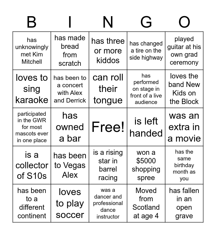 This bingo card has a free space and 29 words: has been to a different continent, is the youngest sibling, has owned a bar, has paraglided on New Years Day, has unknowingly met Kim Mitchell, has three or more kiddos, has been to a concert with Alex and Derrick, has been to Vegas Alex, is left handed, loves to play soccer, was an extra in a movie, has fallen in an open grave, was a dancer and professional dance instructor, Moved from Scotland at age 4, loves the band New Kids on the Block, has been the cause of a CP Rail shut down, is a rising star in barrel racing, is a collector of S10s, played guitar at his own grad ceremony, participated in the GWR for most mascots ever in one place, won a $5000 shopping spree, participated in the world's longest line dance, has performed on stage in front of a live audience, loves to sing karaoke, has changed a tire on the side highway, has made bread from scratch, has the same birthday month as you, can roll their tongue and almost died in quicksand.