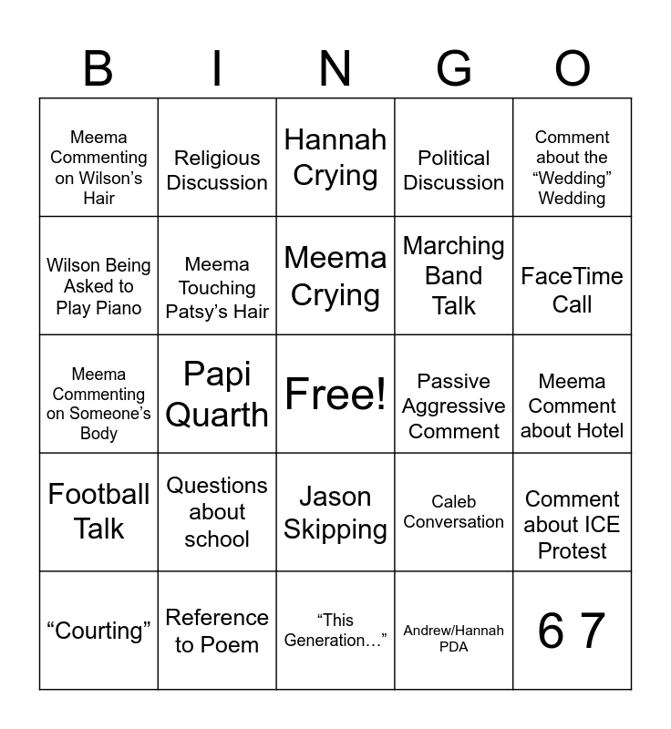 This bingo card has a free space and 24 words: Questions about school, Reference to Poem, Meema Crying, “Courting”, Comment about the “Wedding” Wedding, Meema Commenting on Wilson’s Hair, Wilson Being Asked to Play Piano, Religious Discussion, Passive Aggressive Comment, Jason Skipping, Marching Band Talk, Meema Commenting on Someone’s Body, Caleb Conversation, Comment about ICE Protest, Meema Touching Patsy’s Hair, Andrew/Hannah PDA, Meema Comment about Hotel, Hannah Crying, FaceTime Call, Papi Quarth, 6 7, Football Talk, Political Discussion and “This Generation…”.