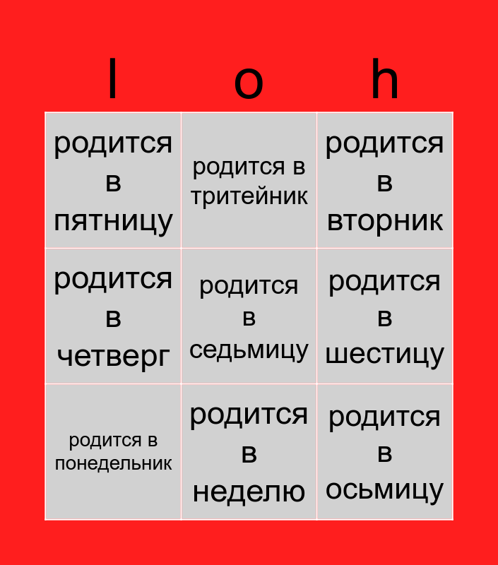 This bingo card has 9 words: родится в понедельник, родится в вторник, родится в тритейник, родится в четверг, родится в пятницу, родится в шестицу, родится в седьмицу, родится в осьмицу and родится в неделю.
