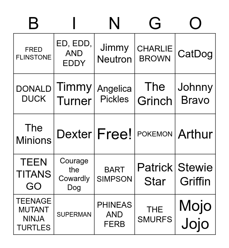 This bingo card has a free space and 54 words: SPONGEBOB SQUAREPANTS, TEEN TITANS GO, BUGS BUNNY, SCOOBY DOO, BART SIMPSON, MICKEY MOUSE, CHARLIE BROWN, WINNIE THE POOH, DONALD DUCK, TOM AND JERRY, FRED FLINSTONE, BATMAN, SUPERMAN, TEENAGE MUTANT NINJA TURTLES, RICK AND MORTY, PHINEAS AND FERB, Mojo Jojo, The Grinch, Tina Belcher, Arthur, Patrick Star, The Joker, POKEMON, CatDog, DORA THE EXPLORER, ED, EDD, AND EDDY, POPEYE THE SAILOR, Kim Possible, YOGI BEAR, THE SMURFS, HECKLE AND JECKLE, LOONEY TUNES, Goofy, ALVIN & THE CHIPMUNKS, Jimmy Neutron, Mufasa, The Minions, Stewie Griffin, Tinker Bell, Timmy Turner, Cosmo & Wanda, Louise Belcher, Homer Simpson, Stitch, Courage the Cowardly Dog, Snoopy, Garfield, The Powerpuff Girls, Angelica Pickles, Dexter, Johnny Bravo, Charlie Brown, Pink Panther and Peter Pan.