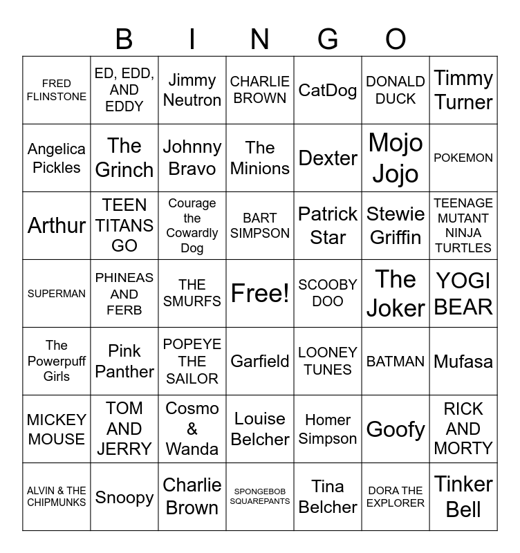 This bingo card has a free space and 54 words: SPONGEBOB SQUAREPANTS, TEEN TITANS GO, BUGS BUNNY, SCOOBY DOO, BART SIMPSON, MICKEY MOUSE, CHARLIE BROWN, WINNIE THE POOH, DONALD DUCK, TOM AND JERRY, FRED FLINSTONE, BATMAN, SUPERMAN, TEENAGE MUTANT NINJA TURTLES, RICK AND MORTY, PHINEAS AND FERB, Mojo Jojo, The Grinch, Tina Belcher, Arthur, Patrick Star, The Joker, POKEMON, CatDog, DORA THE EXPLORER, ED, EDD, AND EDDY, POPEYE THE SAILOR, Kim Possible, YOGI BEAR, THE SMURFS, HECKLE AND JECKLE, LOONEY TUNES, Goofy, ALVIN & THE CHIPMUNKS, Jimmy Neutron, Mufasa, The Minions, Stewie Griffin, Tinker Bell, Timmy Turner, Cosmo & Wanda, Louise Belcher, Homer Simpson, Stitch, Courage the Cowardly Dog, Snoopy, Garfield, The Powerpuff Girls, Angelica Pickles, Dexter, Johnny Bravo, Charlie Brown, Pink Panther and Peter Pan.