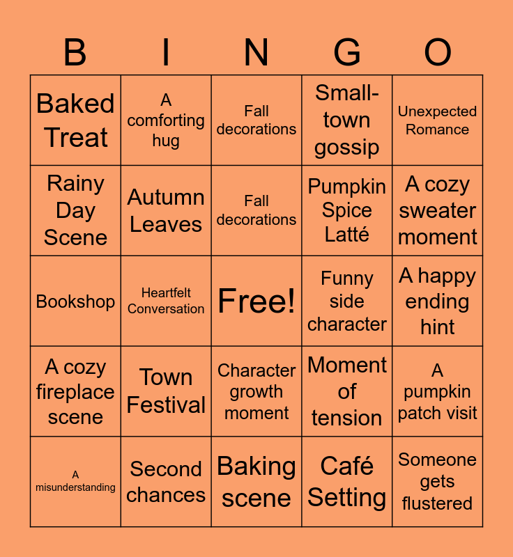 This bingo card has a free space and 24 words: Town Festival, Second chances, Fall decorations, A misunderstanding, Unexpected Romance, Baked Treat, Rainy Day Scene, A comforting hug, Funny side character, Character growth moment, Pumpkin Spice Latté, Bookshop, Moment of tension, A pumpkin patch visit, Autumn Leaves, Café Setting, A happy ending hint, Fall decorations, A cozy sweater moment, Heartfelt Conversation, Someone gets flustered, A cozy fireplace scene, Small-town gossip and Baking scene.