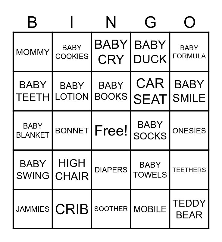 This bingo card has a free space and 45 words: BABYBOTTLE, BONNET, BABY MITTENS, BABY POWDER, TEDDY BEAR, BATH TOYS, BABY COOKIES, BABY WIPES, CAR SEAT, TEETHERS, BABY TEETH, HIGH CHAIR, BABY BOOKS, BABY TOWELS, BABY SHAMPOO, SIPPY CUP, BABY MONITOR, BABY CRY, BABY SWING, BABY SMILE, MOMMY, BIB, SOOTHER, BABY DUCK, BABY FOOD, JAMMIES, BABY BOY, COCO MELO, MOBILE, ONESIES, BOOTIES, CRIB, DIAPERS, BOOSTER SEAT, RASH CREAM, BABY SWING, ORAGEL, KAISEN, DADDY, BABY FORMULA, BABY BLANKET, BABY LOTION, BABY, BABY SOCKS and PLAY PEN.
