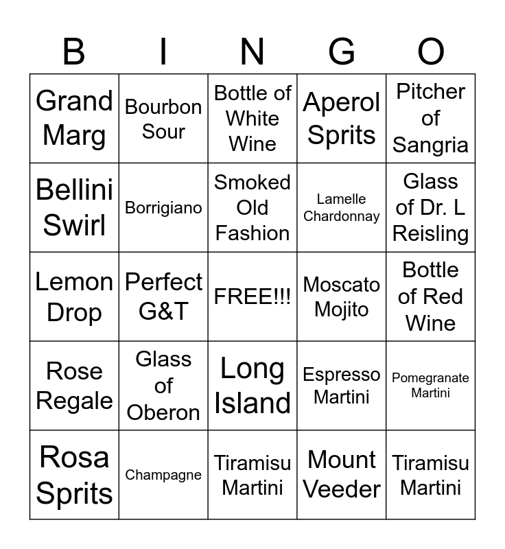 This bingo card has a free space and 24 words: Glass of Oberon, Champagne, Smoked Old Fashion, Rosa Sprits, Pitcher of Sangria, Grand Marg, Bellini Swirl, Bourbon Sour, Moscato Mojito, Long Island, Lamelle Chardonnay, Lemon Drop, Espresso Martini, Pomegranate Martini, Borrigiano, Mount Veeder, Bottle of Red Wine, Bottle of White Wine, Glass of Dr. L Reisling, Perfect G&T, Tiramisu Martini, Rose Regale, Aperol Sprits and Tiramisu Martini.