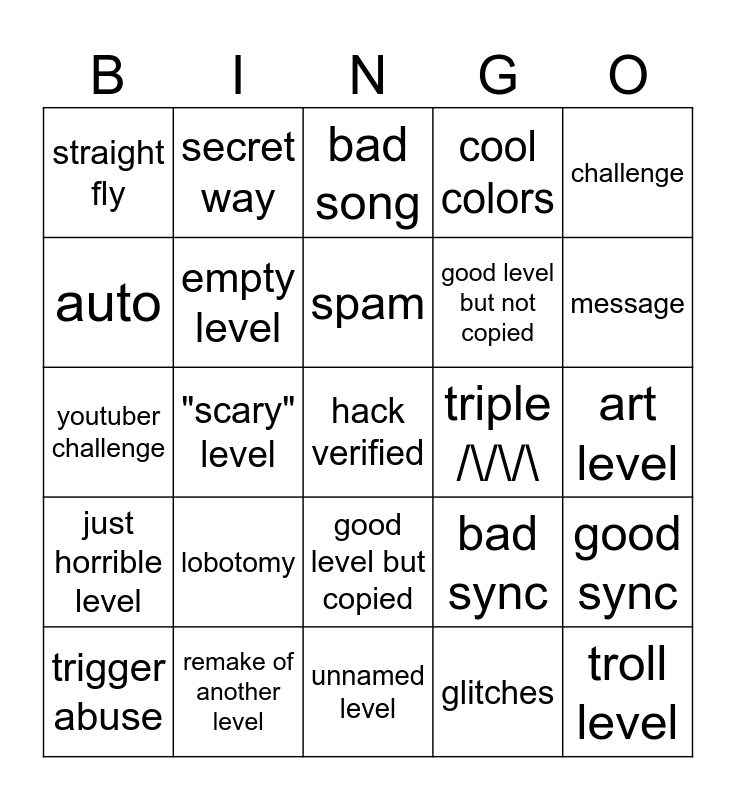 This bingo card has 25 words: lobotomy, unnamed level, spam, trigger abuse, challenge, straight fly, auto, secret way, triple /\/\/\, good level but copied, good level but not copied, youtuber challenge, bad sync, good sync, empty level, troll level, art level, bad song, message, "scary" level, hack verified, remake of another level, just horrible level, cool colors and glitches.