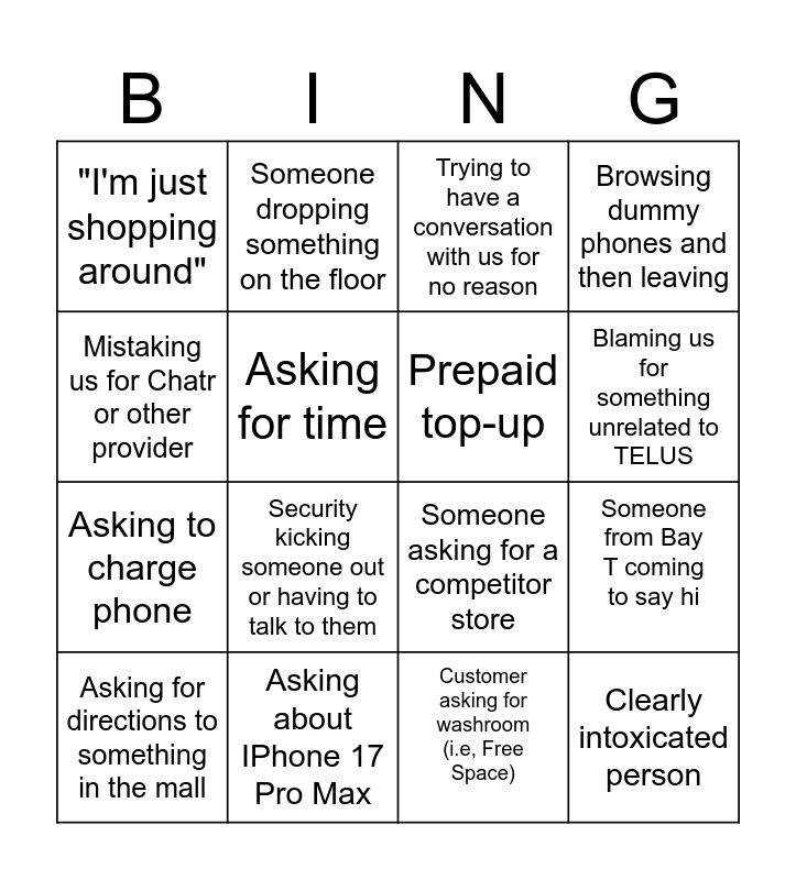 This bingo card has 19 words: Someone asking for a competitor store, Random child yelling, Trying to have a conversation with us for no reason, Clearly intoxicated person, Someone from Bay T coming to say hi, Mistaking us for Chatr or other provider, Customer asking for washroom (i.e, Free Space), "I'm just shopping around", Someone dropping something on the floor, Asking to charge phone, Security kicking someone out or having to talk to them, Asking for time, Prepaid top-up, Asking about IPhone 17 Pro Max, Asking for directions to something in the mall, Someone yelling for no reason, Browsing dummy phones and then leaving, Blaming us for something unrelated to TELUS and Person trying to buy phone with cash.