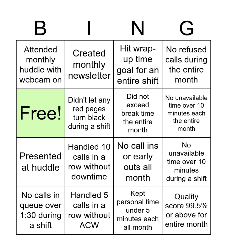 This bingo card has 16 words: Handled 5 calls in a row without ACW, No unavailable time over 10 minutes during a shift, Hit wrap-up time goal for an entire shift, Attended monthly huddle with webcam on, Presented at huddle, Created monthly newsletter, No call ins or early outs all month, Kept personal time under 5 minutes each all month, Free!, Didn't let any red pages turn black during a shift, No calls in queue over 1:30 during a shift, No refused calls during the entire month, Handled 10 calls in a row without downtime, No unavailable time over 10 minutes each the entire month, Did not exceed break time the entire month and Quality score 99.5% or above for entire month.