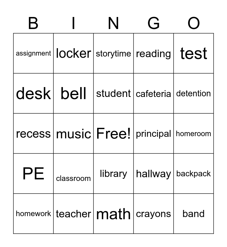 This bingo card has a free space and 24 words: classroom, teacher, student, homework, test, assignment, desk, locker, principal, library, cafeteria, recess, hallway, backpack, bell, crayons, homeroom, storytime, detention, music, band, PE, reading and math.