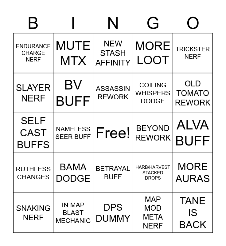 This bingo card has a free space and 24 words: BAMA DODGE, IN MAP BLAST MECHANIC, ASSASSIN REWORK, SNAKING NERF, TRICKSTER NERF, ENDURANCE CHARGE NERF, SLAYER NERF, MUTE MTX, BEYOND REWORK, BETRAYAL BUFF, COILING WHISPERS DODGE, SELF CAST BUFFS, HARB/HARVEST STACKED DROPS, MORE AURAS, BV BUFF, MAP MOD META NERF, ALVA BUFF, NEW STASH AFFINITY, OLD TOMATO REWORK, NAMELESS SEER BUFF, TANE IS BACK, RUTHLESS CHANGES, MORE LOOT and DPS DUMMY.