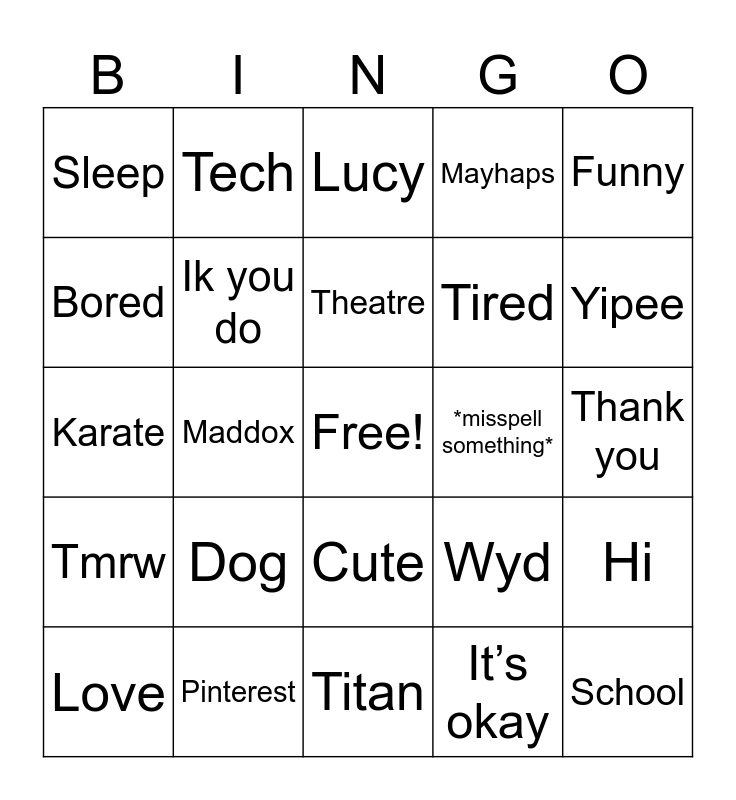 This bingo card has a free space and 24 words: Dog, Pinterest, Theatre, Love, Funny, Sleep, Bored, Tech, *misspell something*, Cute, Tired, Karate, Wyd, Hi, Ik you do, It’s okay, Thank you, Lucy, Yipee, Maddox, School, Tmrw, Mayhaps and Titan.