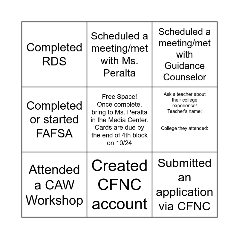 This bingo card has a free space and 8 words: Ask a teacher about their college experience! Teacher's name: College they attended:, Scheduled a meeting/met with Guidance Counselor, Scheduled a meeting/met with Ms. Peralta, Attended a CAW Workshop, Completed RDS, Submitted an application via CFNC, Completed or started FAFSA and Created CFNC account.