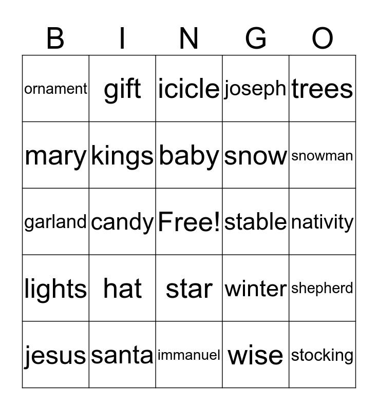 This bingo card has a free space and 24 words: hat, santa, baby, jesus, trees, ornament, mary, gift, stable, star, snow, garland, winter, shepherd, kings, wise, nativity, icicle, snowman, candy, stocking, lights, joseph and immanuel.