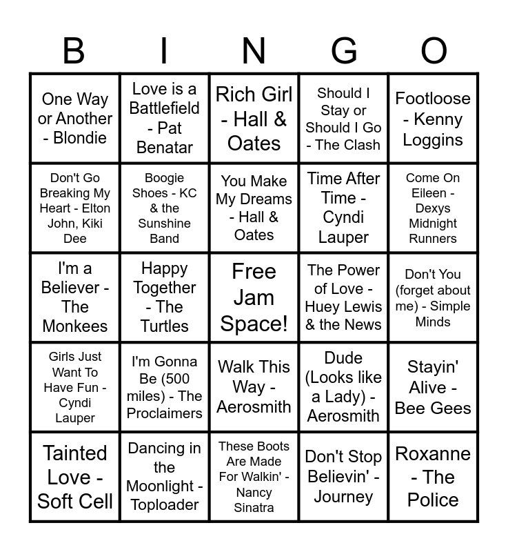 This bingo card has a free space and 34 words: Billie Jean - Michael Jackson, Don't Stop Believin' - Journey, Material Girl - Madonna, Maniac - Michael Sembello, Girls Just Want To Have Fun - Cyndi Lauper, Boogie Shoes - KC & the Sunshine Band, Footloose - Kenny Loggins, Tainted Love - Soft Cell, Love is a Battlefield - Pat Benatar, What's Up? - 4 Non Blondes, You Make My Dreams - Hall & Oates, Rich Girl - Hall & Oates, Uptown Girl - Billy Joel, Piano Man - Billy Joel, The Power of Love - Huey Lewis & the News, Come On Eileen - Dexys Midnight Runners, Dancing in the Moonlight - Toploader, I'm a Believer - The Monkees, I'm Gonna Be (500 miles) - The Proclaimers, Dude (Looks like a Lady) - Aerosmith, Walk This Way - Aerosmith, White Wedding - Billy Idol, One Way or Another - Blondie, Don't You (forget about me) - Simple Minds, These Boots Are Made For Walkin' - Nancy Sinatra, Roxanne - The Police, Should I Stay or Should I Go - The Clash, Any Way You Want It - Journey, Time After Time - Cyndi Lauper, Don't Go Breaking My Heart - Elton John, Kiki Dee, Message In A Bottle - The Police, Happy Together - The Turtles, Stayin' Alive - Bee Gees and Boogie Shoes - KC & The Sunshine Band.