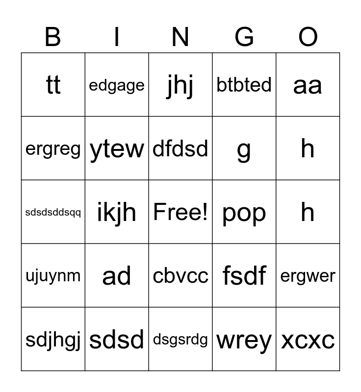 This bingo card has a free space and 24 words: ad, sdsd, dfdsd, sdjhgj, aa, tt, ergreg, edgage, pop, cbvcc, g, sdsdsddsqq, fsdf, ergwer, ytew, wrey, h, jhj, h, ikjh, xcxc, ujuynm, btbted and dsgsrdg.