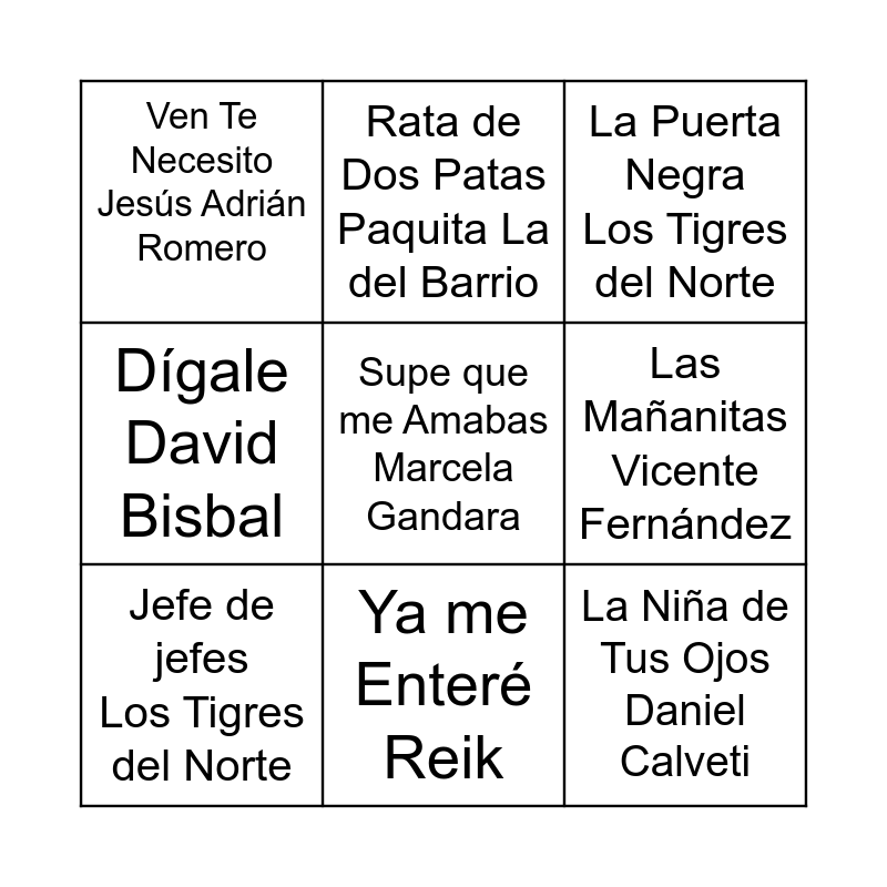 This bingo card has a free space and 8 words: Las Mañanitas Vicente Fernández, La Puerta Negra Los Tigres del Norte, Rata de Dos Patas Paquita La del Barrio, Jefe de jefes Los Tigres del Norte, Ven Te Necesito Jesús Adrián Romero, La Niña de Tus Ojos Daniel Calveti, Dígale David Bisbal and Ya me Enteré Reik.