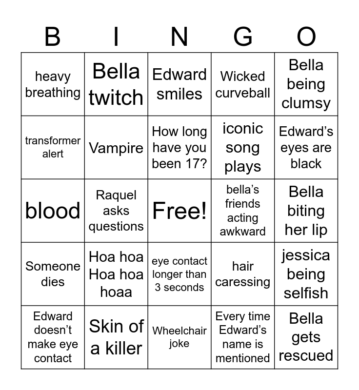 This bingo card has a free space and 24 words: Hoa hoa Hoa hoa hoaa, Skin of a killer, How long have you been 17?, Edward doesn’t make eye contact, Bella being clumsy, heavy breathing, transformer alert, Bella twitch, bella’s friends acting awkward, eye contact longer than 3 seconds, iconic song plays, blood, hair caressing, jessica being selfish, Vampire, Every time Edward’s name is mentioned, Bella biting her lip, Edward smiles, Edward’s eyes are black, Raquel asks questions, Bella gets rescued, Someone dies, Wicked curveball and Wheelchair joke.