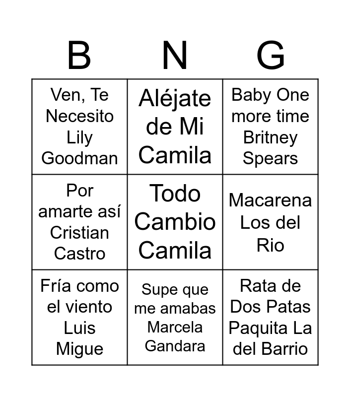 This bingo card has a free space and 8 words: Macarena Los del Rio, Baby One more time Britney Spears, Aléjate de Mi Camila, Fría como el viento Luis Migue, Ven, Te Necesito Lily Goodman, Rata de Dos Patas Paquita La del Barrio, Por amarte así Cristian Castro and Supe que me amabas Marcela Gandara.