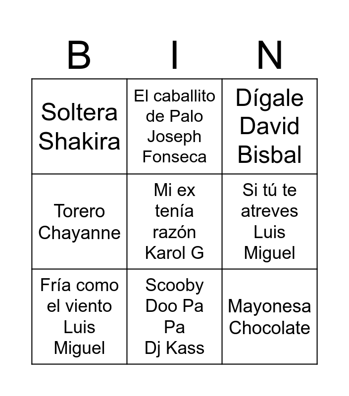 This bingo card has a free space and 8 words: Si tú te atreves Luis Miguel, Dígale David Bisbal, El caballito de Palo Joseph Fonseca, Fría como el viento Luis Miguel, Soltera Shakira, Mayonesa Chocolate, Torero Chayanne and Scooby Doo Pa Pa Dj Kass.