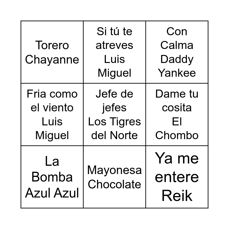 This bingo card has 9 words: La Bomba Azul Azul, Jefe de jefes Los Tigres del Norte, Con Calma Daddy Yankee, Torero Chayanne, Si tú te atreves Luis Miguel, Dame tu cosita El Chombo, Fria como el viento Luis Miguel, Mayonesa Chocolate and Ya me entere Reik.
