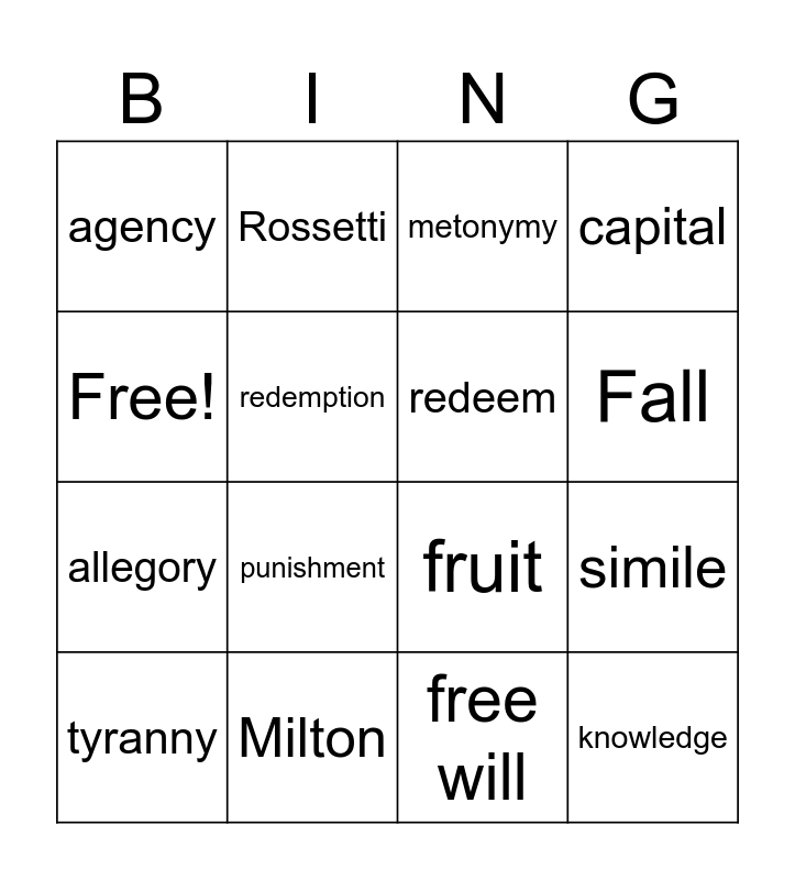 This bingo card has 16 words: Milton, simile, metonymy, agency, allegory, Rossetti, fruit, free will, Free!, redemption, tyranny, capital, punishment, Fall, redeem and knowledge.