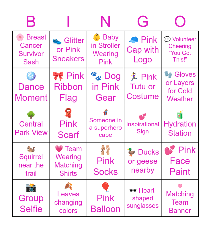 This bingo card has 25 words: ๐ Team Wearing Matching Shirts, ๐ Pink Balloon, ๐พ Dog in Pink Gear, ๐ธ Group Selfie, ๐ฌ Volunteer Cheering โYou Got This!โ, ๐ธ Breast Cancer Survivor Sash, ๐ชฉ Dance Moment, ๐ Glitter or Pink Sneakers, ๐ Inspirational Sign, ๐ฉฐ Pink Socks, ๐โโ๏ธ Pink Tutu or Costume, ๐ณ Central Park View, ๐ฆ Ducks or geese nearby, ๐ Pink Face Paint, ๐ Pink Ribbon Flag, ๐ฉท Matching Team Banner, ๐ง Hydration Station, ๐ถ Baby in Stroller Wearing Pink, ๐งค Gloves or Layers for Cold Weather, ๐งฃ Pink Scarf, ๐ฆธ Someone in a superhero cape, ๐ Leaves changing colors, ๐ฟ๏ธ Squirrel near the trail, ๐งข Pink Cap with Logo and ๐ถ๏ธ Heart-shaped sunglasses.