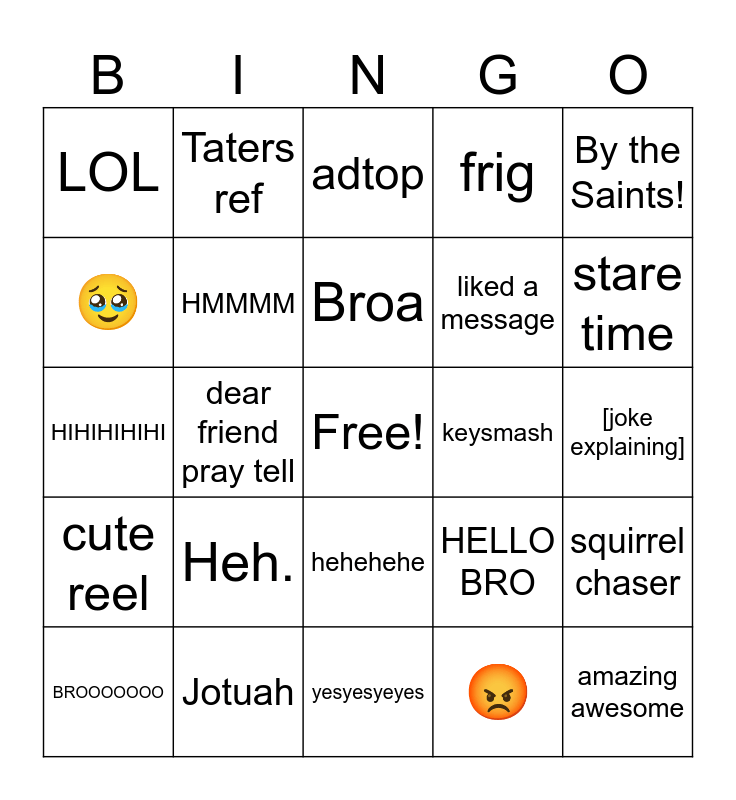 This bingo card has a free space and 24 words: Heh., Jotuah, Broa, BROOOOOOO, By the Saints!, LOL, 🥹, Taters ref, keysmash, hehehehe, liked a message, HIHIHIHIHI, HELLO BRO, squirrel chaser, HMMMM, 😡, [joke explaining], adtop, stare time, dear friend pray tell, amazing awesome, cute reel, frig and yesyesyeyes.