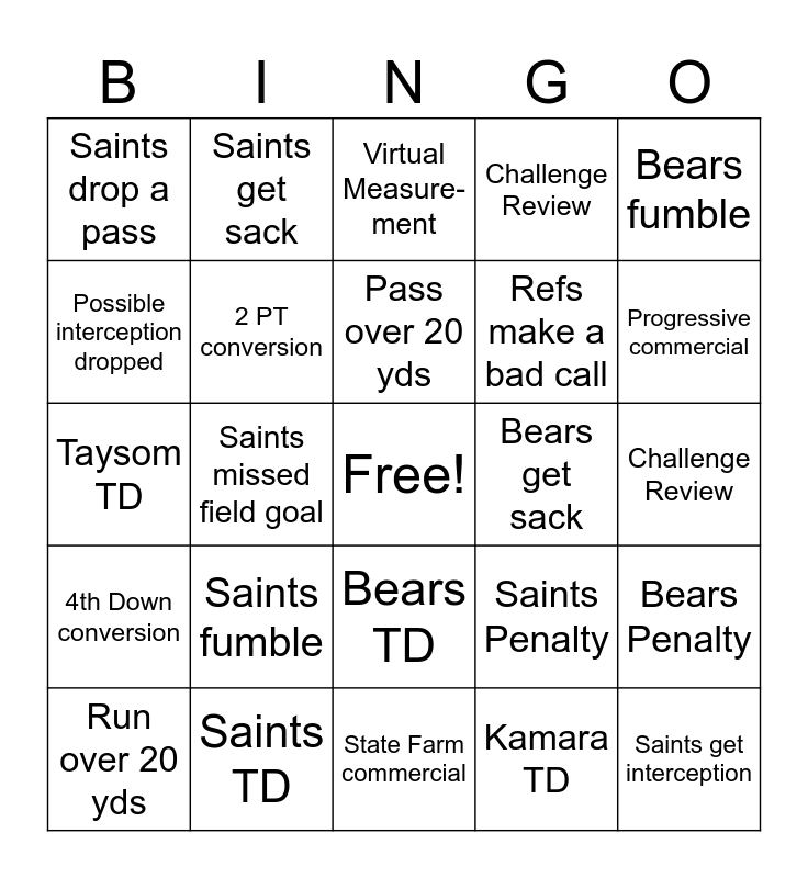 This bingo card has a free space and 24 words: Saints fumble, Saints TD, Pass over 20 yds, Run over 20 yds, Bears fumble, Saints drop a pass, Possible interception dropped, Saints get sack, Bears get sack, Bears TD, Refs make a bad call, Taysom TD, Saints Penalty, Bears Penalty, 2 PT conversion, Kamara TD, Challenge Review, Virtual Measure-ment, Progressive commercial, Saints missed field goal, Saints get interception, 4th Down conversion, Challenge Review and State Farm commercial.