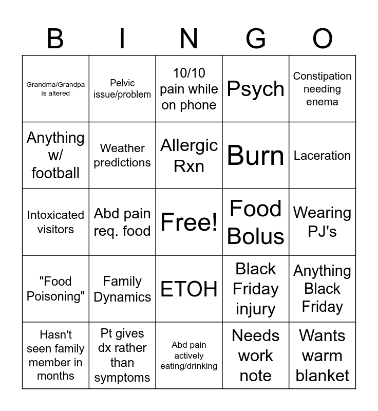 This bingo card has a free space and 24 words: Family Dynamics, Pt gives dx rather than symptoms, Allergic Rxn, Hasn't seen family member in months, Constipation needing enema, Grandma/Grandpa is altered, Anything w/ football, Pelvic issue/problem, Food Bolus, ETOH, Burn, Intoxicated visitors, Black Friday injury, Anything Black Friday, Weather predictions, Needs work note, Wearing PJ's, 10/10 pain while on phone, Laceration, Abd pain req. food, Wants warm blanket, "Food Poisoning", Psych and Abd pain actively eating/drinking.
