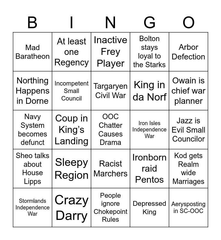 This bingo card has a free space and 24 words: Sleepy Region, Crazy Darry, Targaryen Civil War, Stormlands Independence War, Arbor Defection, Mad Baratheon, Northing Happens in Dorne, At least one Regency, Iron Isles Independence War, Racist Marchers, King in da Norf, Navy System becomes defunct, Ironborn raid Pentos, Kod gets Realm wide Marriages, Incompetent Small Council, Depressed King, Jazz is Evil Small Councilor, Inactive Frey Player, Owain is chief war planner, Coup in King’s Landing, Aerysposting in SC-OOC, Sheo talks about House Lipps, Bolton stays loyal to the Starks and People ignore Chokepoint Rules.