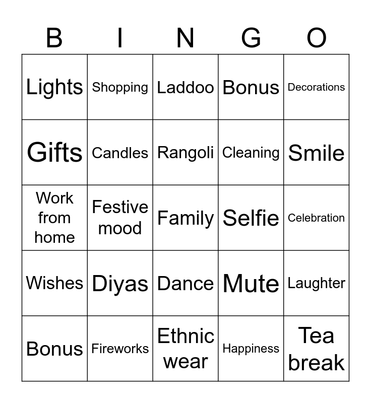 This bingo card has a free space and 24 words: Diyas, Fireworks, Rangoli, Bonus, Decorations, Lights, Gifts, Shopping, Selfie, Dance, Cleaning, Work from home, Mute, Laughter, Candles, Happiness, Celebration, Laddoo, Smile, Festive mood, Tea break, Wishes, Bonus and Ethnic wear.