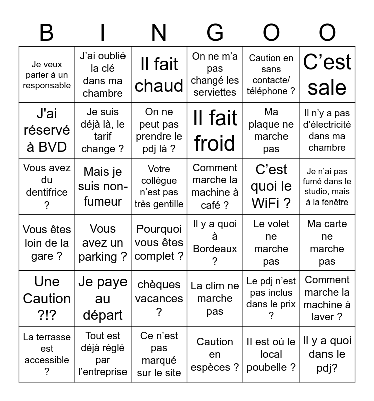 This bingo card has 36 words: Vous êtes loin de la gare ?, Vous avez un parking ?, Ce n’est pas marqué sur le site, Il fait froid, C’est quoi le WiFi ?, Je n’ai pas fumé dans le studio, mais à la fenêtre, Je veux parler à un responsable, Tout est déjà réglé par l’entreprise, Il fait chaud, La clim ne marche pas, Ma plaque ne marche pas, C’est sale, Une Caution ?!?, Mais je suis non-fumeur, On ne peut pas prendre le pdj là ?, On ne m’a pas changé les serviettes, Le pdj n’est pas inclus dans le prix ?, Ma carte ne marche pas, J'ai réservé à BVD, Je suis déjà là, le tarif change ?, Pourquoi vous êtes complet ?, Il y a quoi à Bordeaux ?, Le volet ne marche pas, Comment marche la machine à laver ?, Vous avez du dentifrice ?, J’ai oublié la clé dans ma chambre, Votre collègue n’est pas très gentille, Caution en espèces ?, Caution en sans contacte/ téléphone ?, Il n’y a pas d’électricité dans ma chambre, La terrasse est accessible ?, Je paye au départ, chèques vacances ?, Comment marche la machine à café ?, Il est où le local poubelle ? and Il y a quoi dans le pdj?.