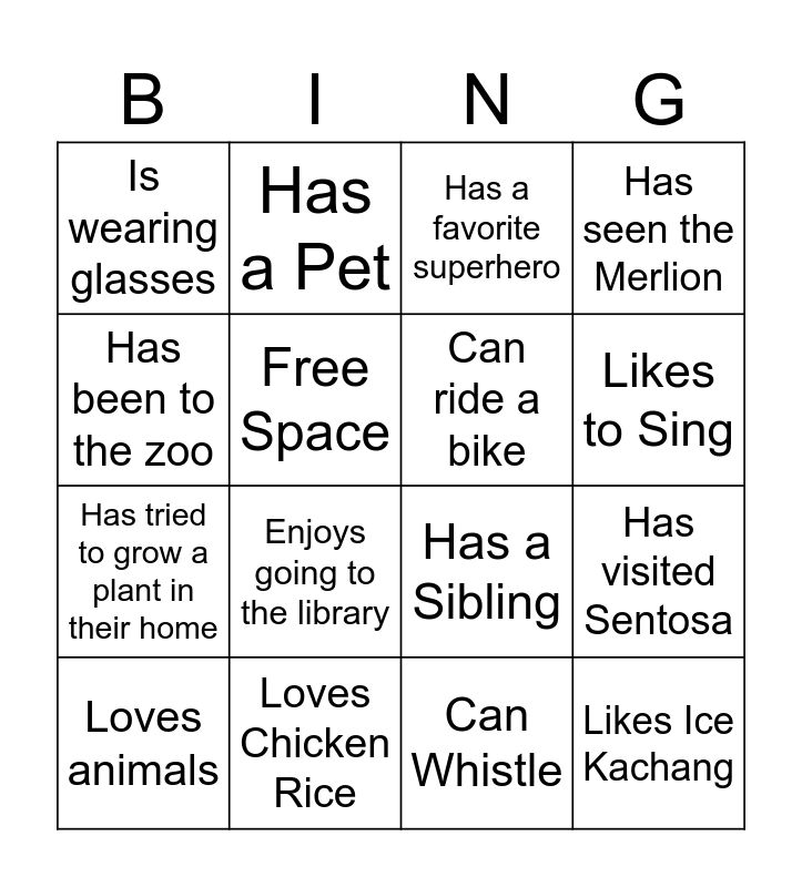 This bingo card has 16 words: Loves Chicken Rice, Has visited Sentosa, Has a favorite superhero, Is wearing glasses, Has tried to grow a plant in their home, Has a Pet, Has a Sibling, Can Whistle, Has been to the zoo, Free Space, Loves animals, Has seen the Merlion, Enjoys going to the library, Likes to Sing, Can ride a bike and Likes Ice Kachang.