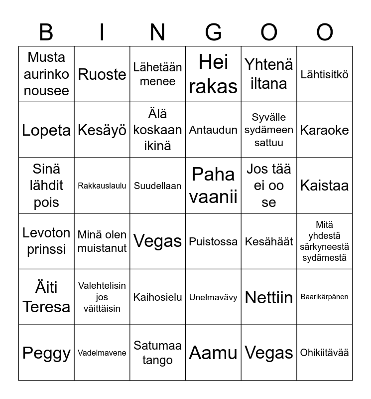 This bingo card has 42 words: Vegas, Kesäyö, Sama nainen, Jos tää ei oo se, Mitä yhdestä särkyneestä sydämestä, Minä olen muistanut, Sinä lähdit pois, Pikkuveli, Lähetään menee, Kaistaa, Suudellaan, Antaudun, Karaoke, Yhtenä iltana, Vadelmavene, Levoton prinssi, Baarikärpänen, Syvälle sydämeen sattuu, Ohikiitävää, Ruoste, Lähtisitkö, Kaihosielu, Äiti Teresa, Musta aurinko nousee, Sankarit, Peggy, Älä koskaan ikinä, Piha ilman sadettajaa, Valehtelisin jos väittäisin, Nettiin, BMW, Paha vaanii, Lopeta, Kesähäät, Satumaa tango, Vegas, Puistossa, Rakkauslaulu, Unelmavävy, Aamu, Hei rakas and Armo.