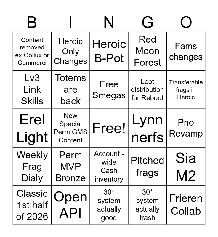 This bingo card has a free space and 24 words: Perm MVP Bronze, Open API, Free Smegas, Classic 1st half of 2026, Fams changes, Content removed ex.Gollux or Commerci, Lv3 Link Skills, Heroic Only Changes, Lynn nerfs, Account -wide Cash inventory, Loot distribution for Reboot, Erel Light, Pitched frags, Sia M2, Totems are back, 30* system actually trash, Pno Revamp, Heroic B-Pot, Transferable frags in Heroic, New Special Perm GMS Content, Frieren Collab, Weekly Frag Dialy, Red Moon Forest and 30* system actually good.