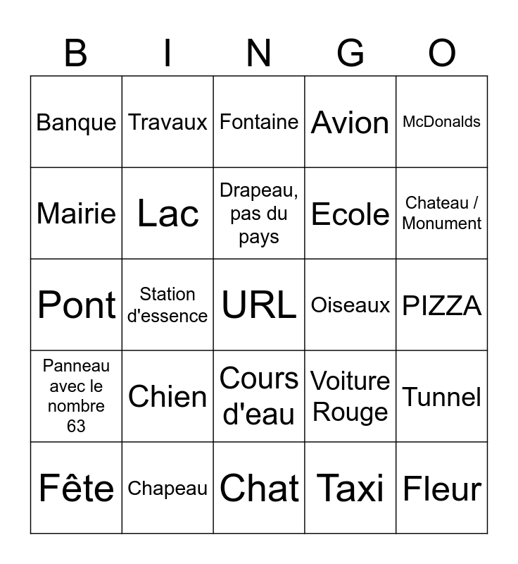 This bingo card has 25 words: Chien, Chat, Drapeau, pas du pays, Fête, McDonalds, Banque, Mairie, Travaux, Oiseaux, Cours d'eau, Ecole, Pont, Voiture Rouge, Tunnel, Lac, Fleur, PIZZA, Fontaine, Chateau / Monument, Station d'essence, URL, Chapeau, Panneau avec le nombre 63, Avion and Taxi.